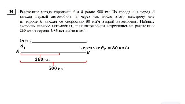Задание 20. Расстояние между городами А и В равно 500 км. Из города А в город В выехал первый автомобиль, а через час после этого навстречу ему из города В выехал со скоростью 80 км/ч второй автомобиль. Найдите скорость первого автомобиля, если автомобили встретились на расстоянии 260 км от города А. Ответ дайте в км/ч. Курс по всем заданиям 1 - 21 базового уровня ЕГЭ по математике: https://stepik.org/a/174709 Курс по заданиям 21 из базового уровня ЕГЭ по математике: https://stepik.org/a/187368 Группа ВК: https://vk.com/secretroom2023 #егэ #математика #база
