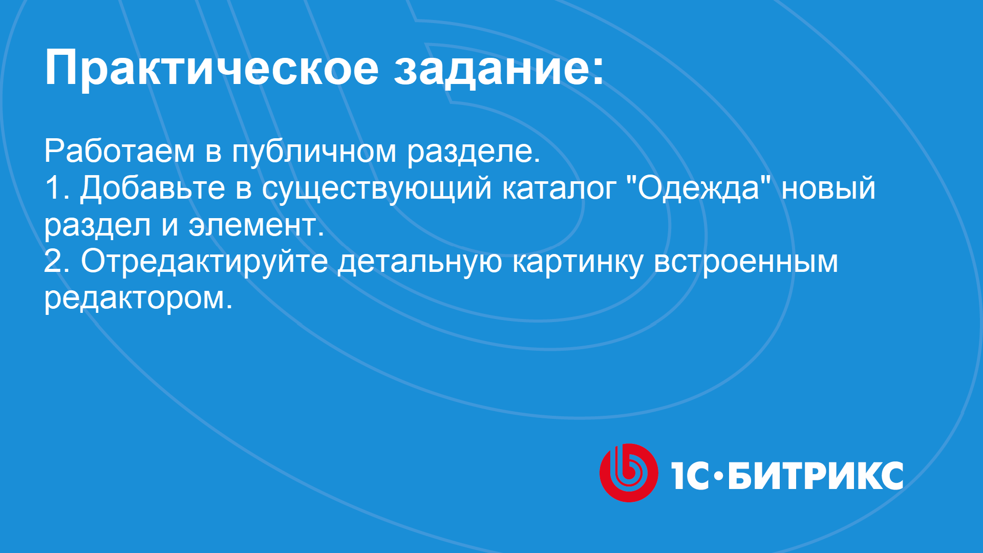 К уроку Практические задания в главе "Информационные блоки: Разделы и элементы": https://dev.1c-bitrix.ru/~HKrJ3 ** видео без голосового сопровождения Задание № 1: Сначала поработаем в публичном разделе. -Добавьте в существующий каталог Одежда новый раздел Свитеры и элемент (товар) в нём. Для элемента (товара) заполните обязательные поля, пару любых свойств и загрузите детальное изображение . Изображение отредактируйте следующим образом: - Зеркально отразите его; - Обрежьте, так чтобы на картинке осталась только кофта, без полей по краям. Обратите внимание: при создании товара понадобится указать его цену. В форме элемента это делается на вкладке Торговый каталог - Цены в поле Базовая цена.