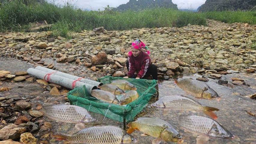 Девушка использует трубы из ПВХ и зелёную сеть для рыбалки. Рыбалка с Анной.