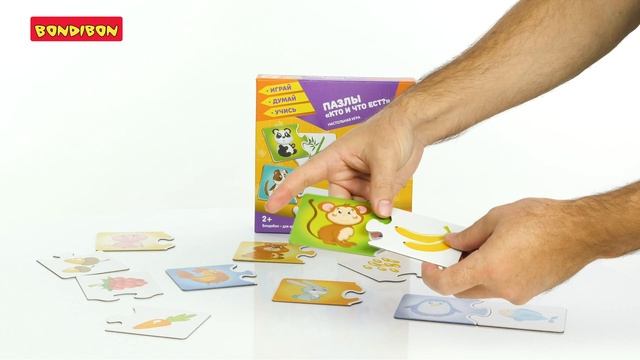 Настольная игра ПАЗЛЫ "КТО И ЧТО ЕСТ?" серии "Играй Думай Учись" от Bondibon - это очень занимательная и познавательная игра, у ребенка развивается зрительное восприятие, логическое мышление, память, мелкая моторика. На обороте каждого пазла прописано название животного и его лакомство. Цель игры – правильно соединить парные картинки: найти изображение животного и его лакомство. В процессе игры малыш познакомится с разными видами животных, узнает, чем они питаются. ПРАВИЛА ИГРЫ: Разложите все пазлы изображениями вверх. Выберите изображение любого животного, например ОБЕЗЬЯНКИ. Чем вы будете кормить ОБЕЗЬЯНКУ? Нужно быть внимательным, чтобы накормить ОБЕЗЬЯНКУ именно её любимым лакомством. Конечно – это БАНАН! В комплект игры серии ""Играй Думай Учись"" (ИДУ) входят 24 двусторонние карточки – пазлы. На 12 пазлах изображены дикие и домашние животные, на других 12 пазлах – их любимые лакомства. Возраст 3+ КОЛИЧЕСТВО ИГРОКОВ: 1-4