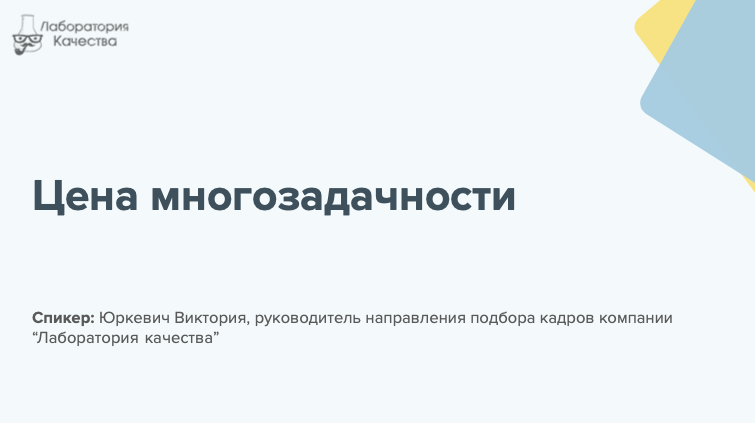 В этом видео Виктория Юркевич, руководитель направления подбора кадров компании "Лаборатория качества", рассказывает о том, какую цену придется заплатить за режим непрерывной многозадачности. Смотрите нас также на YouTube-канале: www.youtube.com/channel/UCUKj7hvw6phelqZPKKJnGBQ