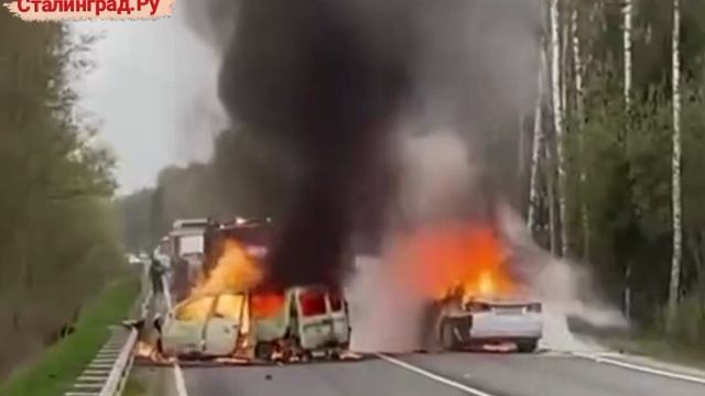 Две легковушки столкнулись в Подмосковье: от удара обе машины загорелись.
