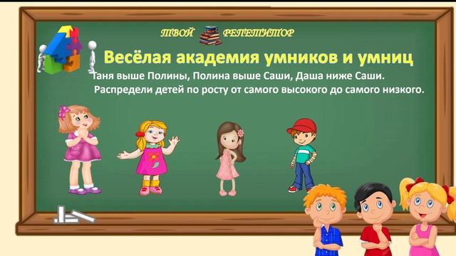 Решаем логическую задачу. Таня выше Полины, Полина выше Саши, Даша ниже Саши. Распредели детей по росту от самого высокого до самого низкого. 📌 Запись на индивидуальные занятия по предметам МАТЕМАТИКА, РУССКИЙ ЯЗЫК, ВПР, МЦКО с 1 по 4 класс: https://vk.com/gim213583492 ✓ Понравилось? Подпишись!
