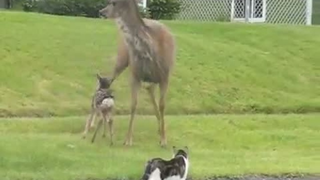В Канаде мама оленёнка гуляла по улице городка и решила, что собака - друг человека, а нее ее. Да и кошки тоже ей не нужны.