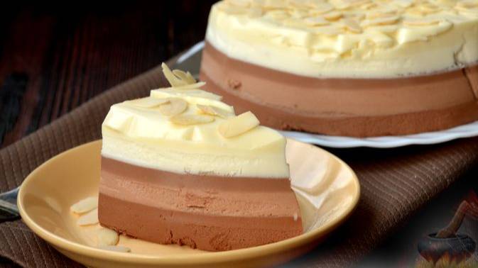 Муссовый торт «Три шоколада» готовится без выпечки. Три разноцветных слоя достигаются путем добавления в молочно-сливочную массу с желатином чёрного, молочного и белого шоколада. Получается очень нежный, вкусный и нарядный десерт! #ТортПраздничный #МуссовыйТорт #ТортБезВыпечки #ТортТриШоколада #ТортНовогодний