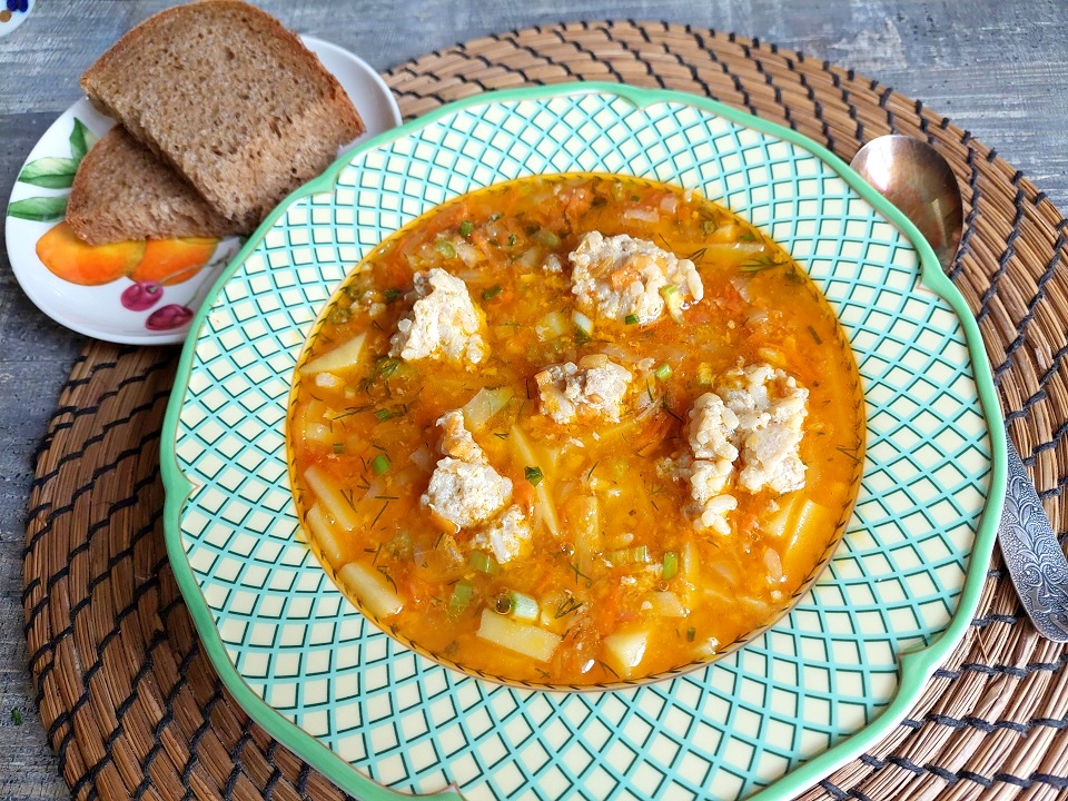 Одна из идей домашнего обеда. Насыщенное первое блюдо на мясном бульоне, с обилием овощей. Сочетание традиционных овощей более, чем удачное. Суп густой, сытный и ароматный. ИНГРЕДИЕНТЫ: • Бульон мясной – 1 л • Фарш мясной – 150 гр • Соль – 0,5 чл • Растительное масло – 1,5 стл • Картофель – 3 шт • Морковь = ½ шт • Лук репчатый – ½ шт • Лук зелёный – 1 шт • Укроп – 2 веточки – сельдерей черешковый – ½ стебля • Капуста белокочанная – 90 гр • Соус томатный – 6 стл Бульон довести до кипения. Добавить нарезанные картофель и капусту. Для поджарки измельчить репчатый лук и морковь, пассеровать их до готовности. Затем добавить томатный соус. Дать поджариться всем ингредиентам вместе. В бульон, за пять минут до готовности овощей, добавить порционно (чайной ложкой) фарш, а через пять минут в кастрюлю переложить поджарку. Пока всё вместе кипит - порезать зелень. Зелень добавить в конце варки и выключить. Суп готов, дать ему настояться минут двадцать. Подавать в горячем виде. По желанию, к супу можно подать сметану. ПРИЯТНОГО АППЕТИТА!