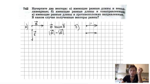 №742. Начертите два вектора: а) имеющие равные длины и неколлинеарные
