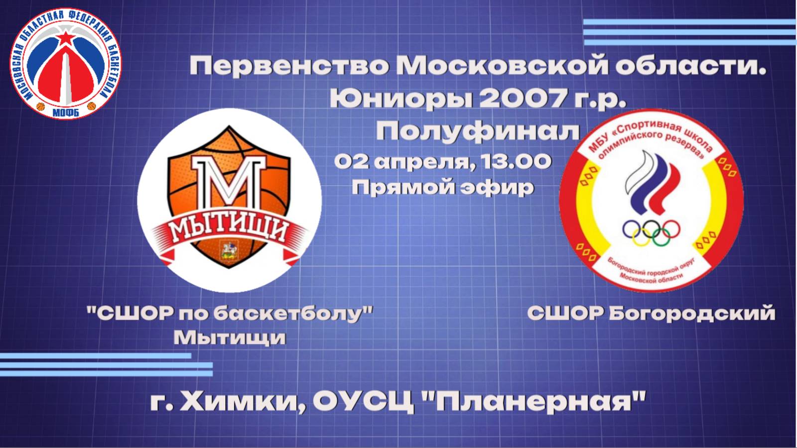 13:00 "СШОР по баскетболу" Мытищи-СШОР Богородский 15:00 СШОР №1 Химки-СШОР "Спартак" Люберцы