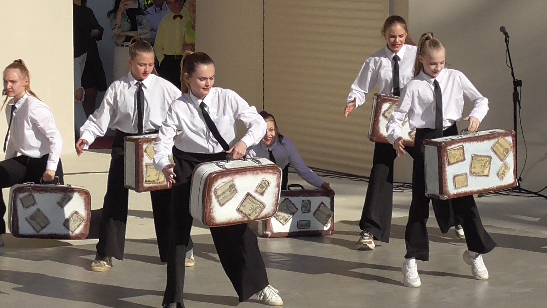 Танцевальный коллектив танцует танец с чемоданами