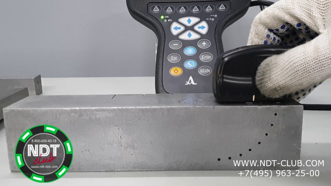 Демонстрация ультразвукового контроля дефектоскопом-томографом А1525 SOLO образца со сверлениями