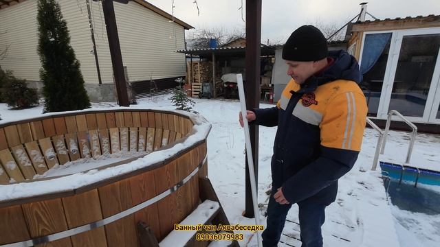 наша уникальность и исключительность: банный чан Аквабеседка - это самый технологичный и продуманный чан на 8 человек. (89036079983 купить банный чан Аквабеседка) Аквабеседка - это джакузи на дровах! Абсолютно законченная круглая двух метровая бочка из нержавейки, высота 1, 07 м с подсветкой теплым светом всего вокруг. Такая уникальная форма позволяет спрятать огромную топку внутри Аквабеседки под отдыхающими. 2,5 м2 это 90 % площади сидушки. Максимальный тепловой съем. Нагрев зимой дубовыми топливными брикетами за 1 час 20 минут с 0 до 40 градусов. Да ещё и турбонаддув в топке -это наше изобретение. Внутри Аквабеседки полно места и Ничего не мешает и не отнимает полезного пространсва Все пространство только для отдыхающих вместимость 8 человек. Максимальный рекорд 15. Вы сидите в удобном положении, в фильтрованной чистой воде, приятно дотронуться до деревянных поверхностей, приятные тактильные ощущения всеми частями тела Джакузи на 8 форсунок включается пневматической кнопкой, Джакузи можно пользоваться в любой мороз, ничего не перемерзает и вода в трубах не охлаждается, так как все трубы находятся внутри бочки в горячей воде. Подводная безопасная подсветка всех цветов радуги. Кайф И снаружи дополнительно ничего не стоит отдельно. Разве что только лестница, но мы ее делаем специально такую маленькую и аккуратненькую , чтобы лестница не отвлекала внимания от Аквабеседки. Шикарный внешний вид. снаружи и внутри все отделано лиственницей Лиственница это надолго. А под лиственницей уже спрятана особая конструкция нержавеющей бочки с интегрированной в нее турбированной топкой. Эта цилиндрическая конструкция делает Аквабеседку прежде всего безопасной и устойчивой. В нее легко залезать и вылезать и это безопасно, перевернуть Аквабеседку невозможно, высота 1, 07 м Быстрый доступ под деревянную отделку внутри Аквабеседки для помыть или почистить нержавеющая бочка с гарантией 5лет от сквозной корозии. внутри моторного отсека : насос джакузи, блок электрики, фильтр для воды так же можно пользоваться круглогодично. и турбонаддув. теплый моторный отсек зимой не охлаждает воду внутри труб и насоса джакузи. Сами трубы до форсунок находятся внутри Аквабеседки Вода во всех трубах всегда теплая Аквабеседка может использоваться на газу, в нее подходит газовая горелка 50 ТРБ на 50 кВт ( скорость нагрева чана 1 час 40 минут с 0 до 40 градусов). Или топите топливными брикетами из дуба - они совсем не дымят! Аквабеседка подарит вам и вашей семье новые приятные ощущения и часы удовольствия!