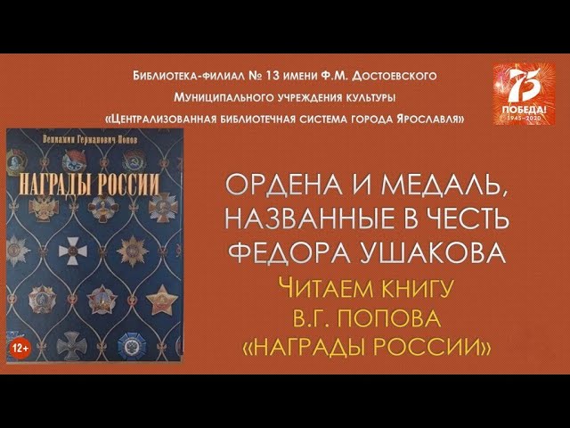 Предлагаем продолжить чтение новой книги «Награды России» Вениамина Германовича Попова — полковника в отставке, ветерана Вооруженных сил РФ, известного краеведа. Чтение посвящено 75-летию Великой Победы и 175-летию со дня рождения адмирала Российского флота святого праведного Феодора Ушакова. Фрагменты статей об... Читать далее → https://clib.yar.ru/biblioteka-13/chitaem-knigu-veniamina-popova-nagrady-rossii/