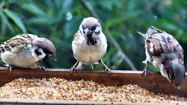 Воробьи в кормушке летом
