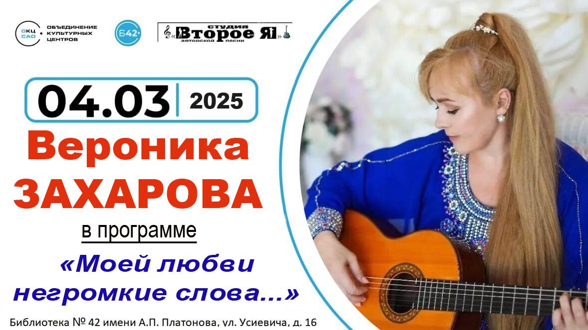 Также в концерте принял участие Олег Самсонов. Продолжительность – 1 час 11 минут. Библиотека № 42 имени А. Платонова: Москва, улица Усиевича, дом 16 (метро «Сокол»). 4 марта 2025 года.