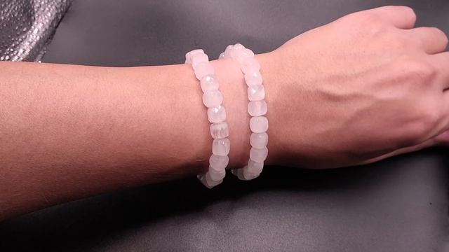 Браслет из бусин: Розовый Кварц. Гранёные кубы на резинке. Место добычи камня - Мадагаскар. Нежно-розовый/бледно-розовый. 100% природный камень, без облагораживания. Размер бусин: ~8.2 мм На запястье в обхвате: 1) - 18 см 2) - 17 см Б69