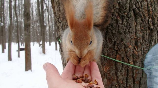 Кормлю того самого бельчонка. Он неплохо выглядит