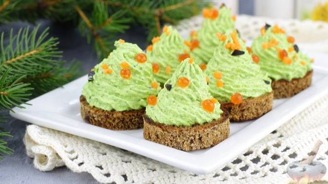 Красочная закуска из простых продуктов к праздничному столу - творожные ёлочки со шпинатом. Готовится очень просто - нужно всего-то перебить творог со шпинатом в однородную массу и отсадить в виде ёлочек на подсушенные на сковороде ломтики хлеба. Чтобы творожные ёлочки смотрелись по-новогоднему, украшаем их икрой и кусочками моркови и маслин. #НовогодниеЗакуски #ХолодныеЗакуски #Бутерброды