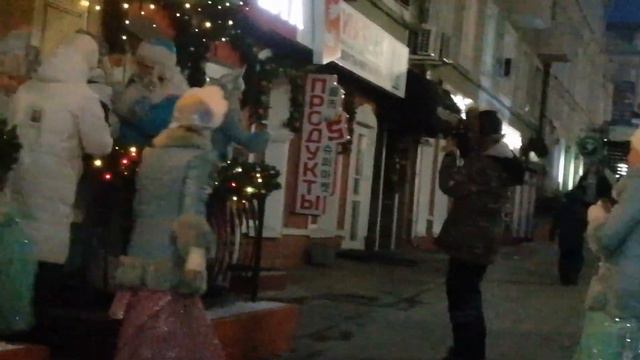 Вечер 1 января, по пути с набережной на площадь. Дед Мороз и много снегурочек.