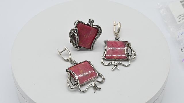 •Авторское украшение ручной работы. Камни установлены в оправу из ювелирного сплава - нейзильбер. •Форма и рисунок камня никогда не повторяются, что делает данное изделие единственным в своем роде. •Габарит кольца 28*33мм, серьги: 32*41мм., вес 13 г •Швензы изготовлены из серебра проба отсутствует. •Указаны габариты серьги без швензы. •На поверхности камня допустимо присутствие естественных природных прожилок и микротрещин. •При заказе вы покупаете образец, который представлен на фото. Цена: 13 482 руб. https://radugakamnya.ru/catalog/ukrasheniya_iz_kamnya_po_tipam/koltso_i_sergi_1/koltso_i_sergi_iz_rodonita_orlets_razmer_18_6-204457/