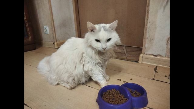 Котик Снежок: утренний аппетит нашего мальчика не мог не порадовать волонтера
