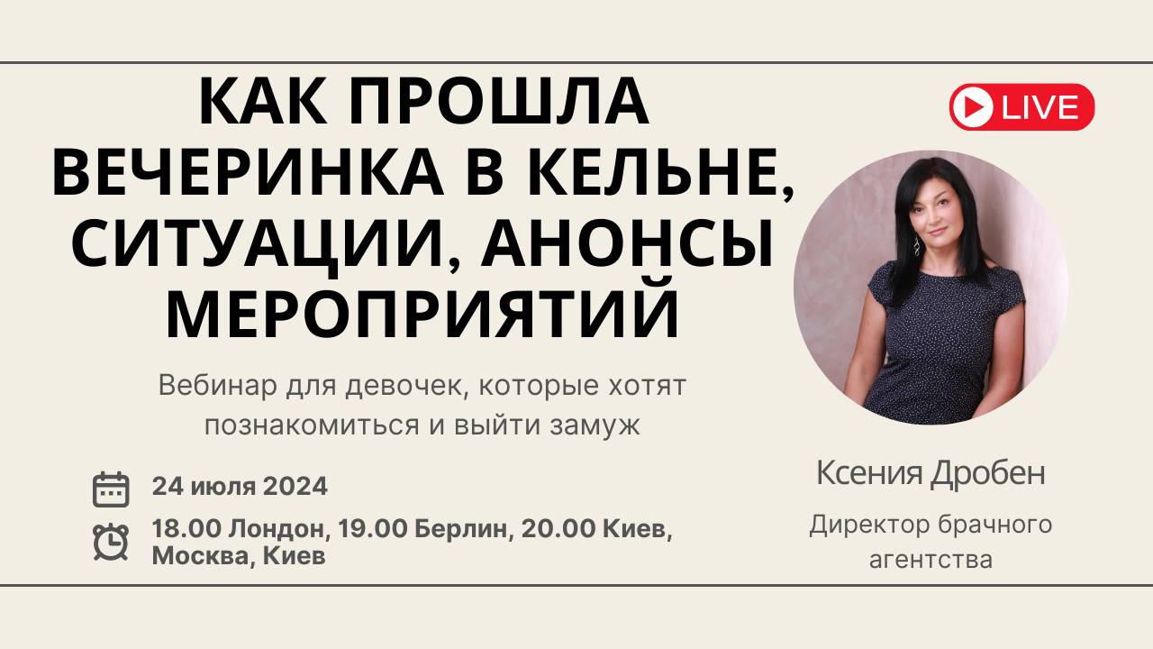 Сегодня мы встречаемся с вами на вебинар – посплетничаем про вечеринку знакомств в Кельне и вареники, обсудим наши дальнейшие планы, отвечу на ваши вопросы Девочкин вебинар состоится в среду, 24 июля Если вы не сможете принять участие в прямом эфире, то запись останется на YouTube Время: 18.00 по Лондону, 19.00 по Берлину, 20.00 по Киеву, Минску и Москве Вебинар пройдет на платформах: на канале YouTube Ksenia Droben https://www.youtube.com/@KseniaDrobenPartnervermittlung На странице Facebook https://www.facebook.com/ksenia.droben В группе Facebook https://www.facebook.com/groups/datingmarriageagency VK https://vk.com/kseniadroben Instagram @kseniadroben Tiktok: @kseniadrobendating Буду рада увидеться с Вами и ответить на ваши вопросы! Что будет происходить в агентстве дальше: 24 августа – празднование дня рождения агентства и презентация книги Ксении Дробен в Санкт-Петербурге. Если соберется группа мужчин на вечеринку, то мы пригласим мужчин и на День Рождения https://forms.gle/xEcgUDBVdVFTQKuu7 7 сентября – онлайн вечеринка знакомств в Zoom https://droben-partnervermittlung.de/ru/dating-event-zoom/ 14 сентября – вечеринка знакомств в Берлине https://droben-partnervermittlung.de/ru/dating-vecherinka-berlin/ C 25 июля по 8 августа я буду находиться в Китае, так что все сообщения отправлять только по мейлу. Я не уверена, что смогу стабильно отвечать в Whatsapp. Спасибо! С уважением Дробен Ксения www.droben-partnervermittlung.de