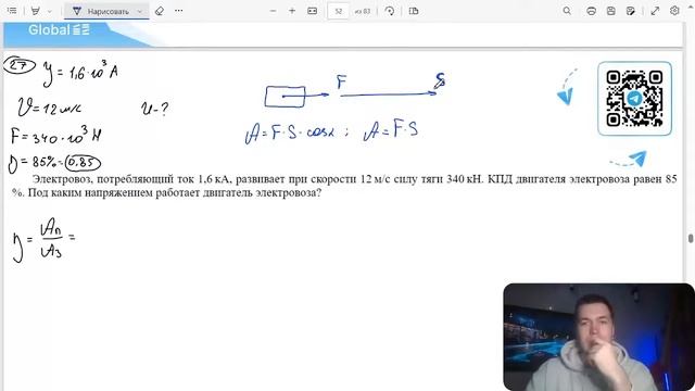 Электровоз, потребляющий ток 1,6кА, развивает при скорости 12 м_с силу тяги 340 кН. КПД - №26041