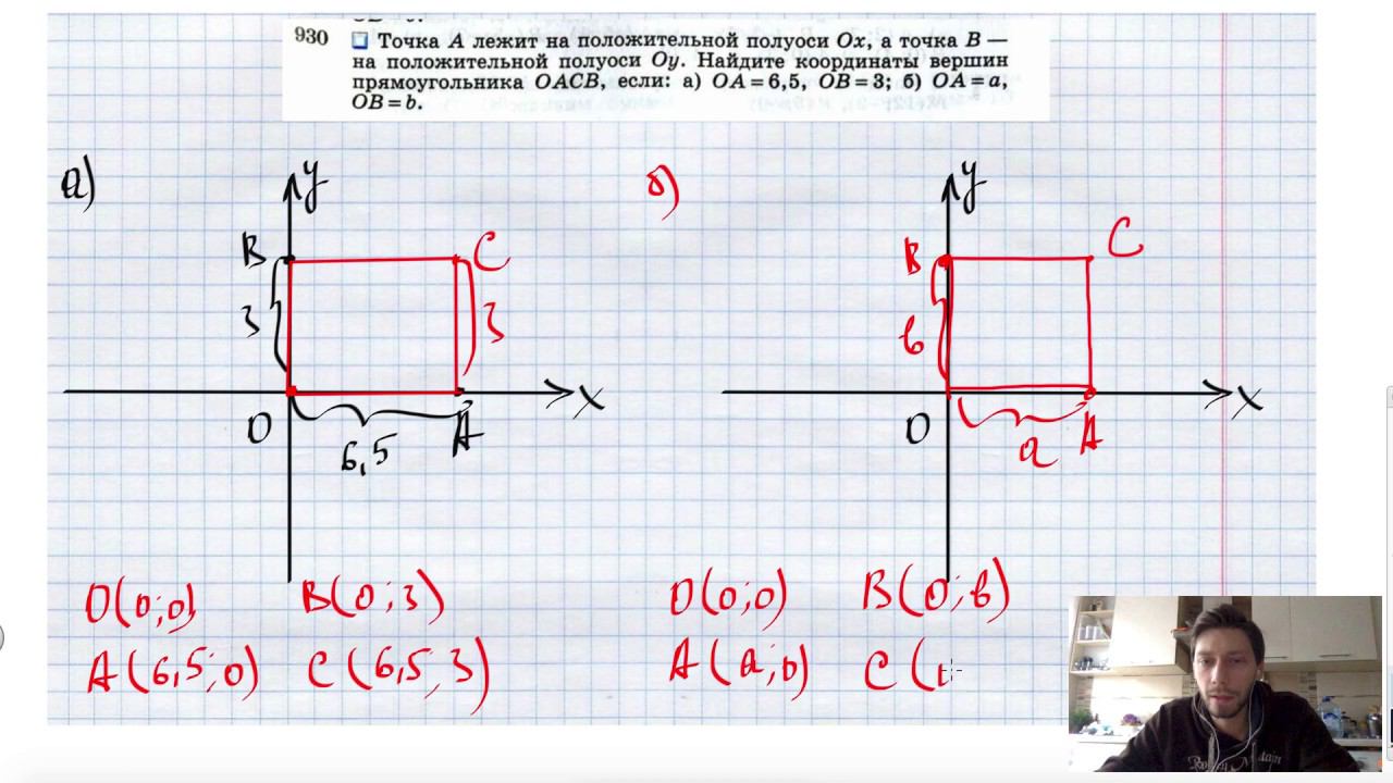 №930. Точка А лежит на положительной полуоси Ох, а точка B — на положительной полуоси Оу. Найдите координаты вершин прямоугольника ОАСB, если: а) ОА=6,5, OB=3; б) ОА=а, OB = b. Поддержать канал рублём - 5469400944002125 (Сбербанк) Мой второй канал для подготовки к ЕГЭ и ОГЭ - https://www.youtube.com/ЕвгенийСумин Инстаграм - https://www.instagram.com/EGE_OGE.math Личный инстаграм - https://www.instagram.com/ee_sumin VK - https://vk.com/evgeniysumin FB - https://www.facebook.com/EvgeniySumin