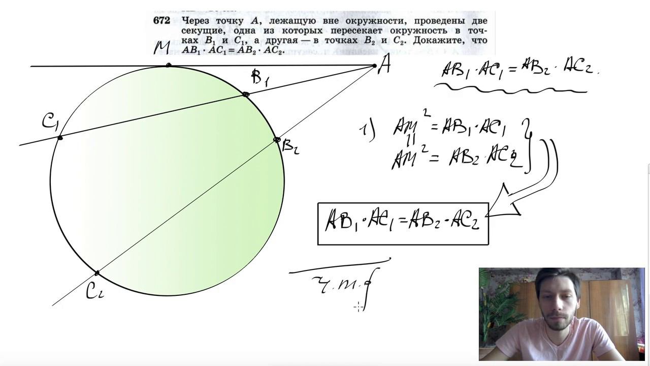 №672. Через точку А, лежащую вне окружности, проведены две секущие, одна из которых пересекает окружность в точках B1, C1 а другая — в точках В2, С2. Докажите, что АВ1⋅АС1=АВ2⋅АС2. Поддержать канал рублём - 5469400944002125 (Сбербанк) Мой второй канал для подготовки к ЕГЭ и ОГЭ - https://www.youtube.com/ЕвгенийСумин Инстаграм - https://www.instagram.com/EGE_OGE.math Личный инстаграм - https://www.instagram.com/ee_sumin VK - https://vk.com/evgeniysumin FB - https://www.facebook.com/EvgeniySumin