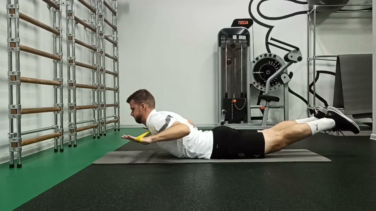 Можно выполнять с мини-бендом, резиновым жгутом, гимнастической палкой, гантелями и пр. Отлично подходит для профилактики нарушений осанки. Укрепляет мышцы спины.