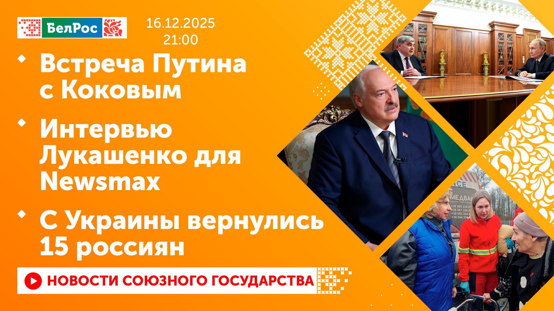 Закадровый текст озвучивает *ИИ Антон* Новости 16.12.2025 на 21:00 - Владимир Путин встретился с главой Кабардино-Балкарии Казбеком Коковым. - Александр Лукашенко дал интервью американскому телеканалу Newsmax. - Семьи из России и Украины воссоединились со своими близкими. - Ушёл из жизни бывший ведущий телеканала "БелРос" Максим Максимов. Смотрите главные новости Союзного государства на телеканале БелРос. Ссылки на наши соц. сети Сайт: http://belros.tv/ Telegram: https://t.me/belrostv Одноклассники: https://ok.ru/group/55657426976918 ВКонтакте: https://vk.com/belrostv TikTok: https://www.tiktok.com/@belros_tv?_t=... RuTube: https://rutube.ru/channel/23501830/ Яндекс. Дзен: https://zen.yandex.ru/belrostvv Наши подкасты на Яндекс. Музыке: https://music.yandex.ru/album/25615251 #главныеновости #новостисегодня #СоюзноеГосударство