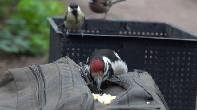 Птенец дятла учится питаться самостоятельно