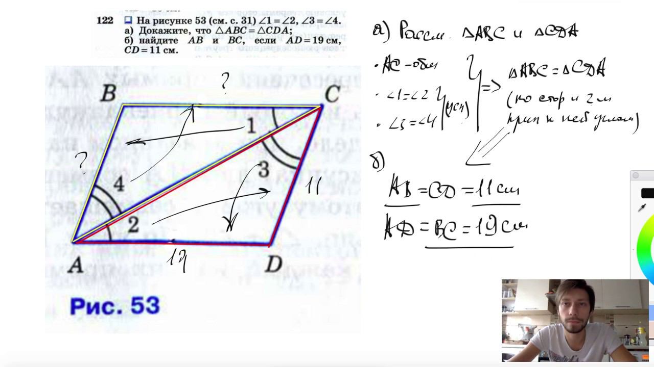 №122. На рисунке 53 (с. 31) ∠1 = ∠2, ∠3 = ∠4. а) Докажите, что ΔАВС=ΔCDА; б) найдите АВ и ВС, если AD= 19 см, CD=11 см. Поддержать канал рублём - 5469400944002125 (Сбербанк) Мой второй канал для подготовки к ЕГЭ и ОГЭ - https://www.youtube.com/ЕвгенийСумин Инстаграм - https://www.instagram.com/EGE_OGE.math Личный инстаграм - https://www.instagram.com/ee_sumin VK - https://vk.com/evgeniysumin FB - https://www.facebook.com/EvgeniySumin
