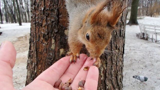 Кормлю двух белок в дождь