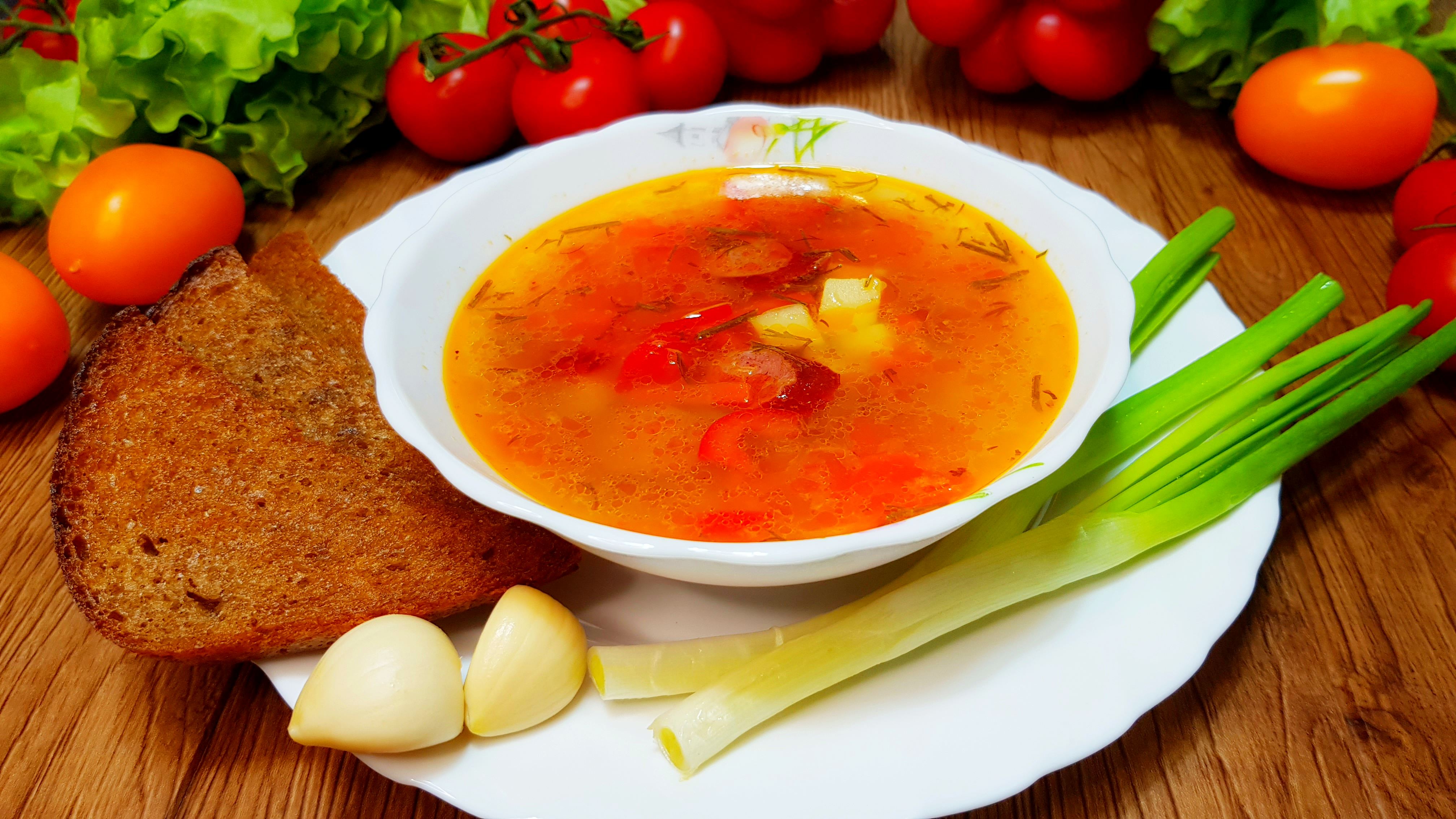 Наваристый суп с охотничьими колбасками и болгарским перцем – очень простой и невероятно вкусный