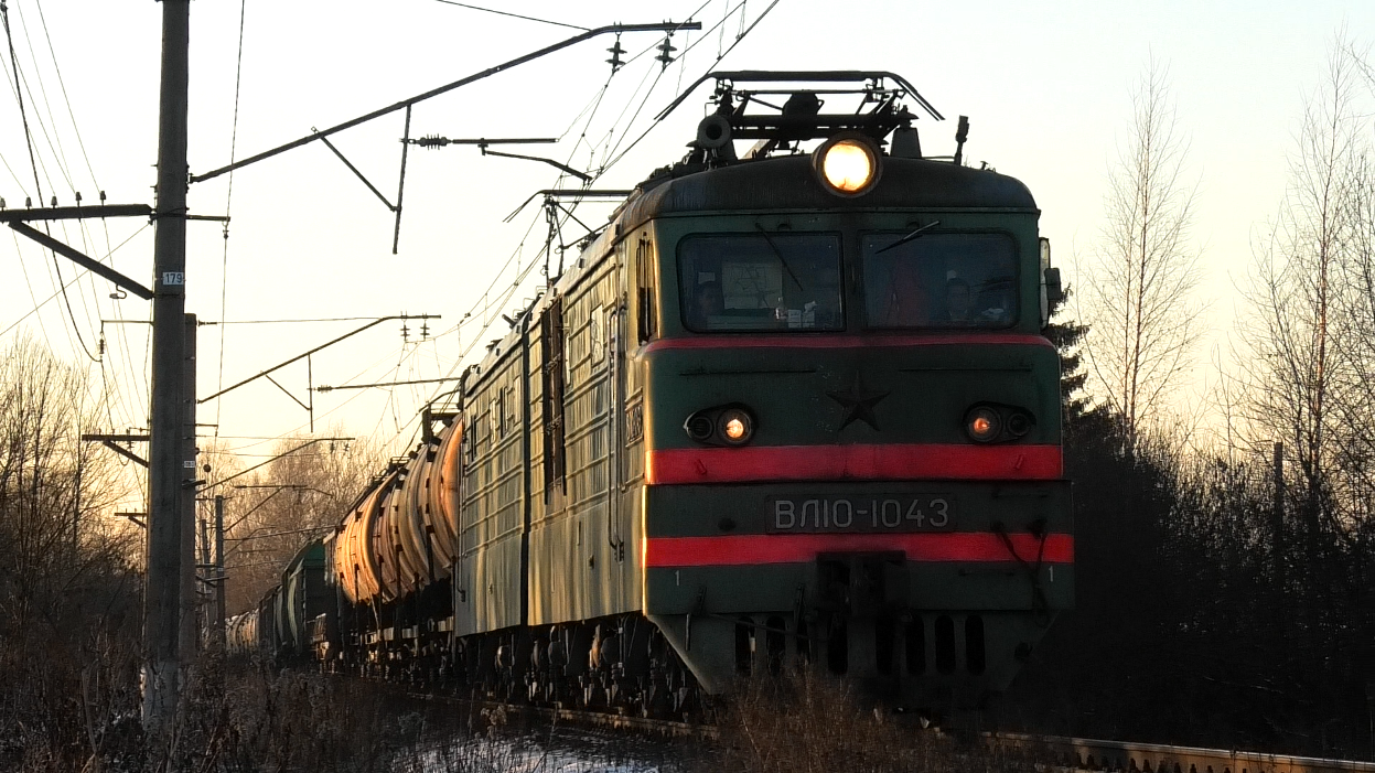 Электровоз ВЛ10-1043 (списан: 09.2023) с грузовым поездом следует по перегону Торжок - Терешкино. Октябрьская ЖД. Город Торжок, Тверская область, Россия. Приписка: ТЧЭ-21 Волховстрой. 08.12.2020