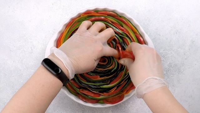 Легкая и яркая запеканка из разноцветных овощей, закрученных спиралью — идеальное весеннее блюдо. Вкусно, просто и невероятно радует глаз! Обычно ее готовят в виде тарта, на тонком песочном тесте, но мы сделали более диетический вариант без мучной основы. Продукты: — Баклажан 400 г — Кабачки цукини 500 г — Морковь 350 г — Помидоры 400 г — Сыр 150 г — Яйца куриные 2 шт — Сливки 20% 200 мл — Соль, специи по вкусу Приготовление: 1. Баклажаны нарезать тонкими пластиками. Если овощ крупный, то разрезать вдоль пополам. Посыпать солью и оставить на 15 минут, потом промыть под проточной водой. (Если баклажаны молодые, то солью можно не посыпать.) Кабачки и морковь нарезать тонкими полосками, помидоры кружочками. 2. В форму выложить по спирали нарезанные овощи (баклажан, морковь, цукини). Затем между рядами вставить кружки помидора. 3. Яйца взбить со сливками, добавить специи по вкусу (у нас хмели-сунели), залить получившейся смесью овощи. Немного потрясти форму, чтобы заливка равномерно распределилась. Сверху посыпать натертым сыром и поставить в разогретую до 180С духовку на 40-45 минут. Овощи должны остаться немного альденте. Если не любите хрустящие овощи, можно увеличить время приготовления на 10-15 минут. Вынуть из духовки, дать постоять минут 15. Делайте покупки на нашем сайте https://www.delikateska.ru/ МЫ в VK: http://www.vk.com/delikateska