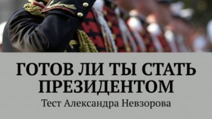 Книга и Чудо Александра Невзорова Веришь в чудеса? Правильно, я тоже верю. Чудеса происходят спонтанно и неожиданно, вот как на этой странице. Вера — великая вещь, она открывает такие горизонты, которые невозможно осмыслить рассудком. Верь в чудеса, они случаются, примером тому данная страница. Кто Прочтёт до конца отрывок текста ниже, тот получит шанс выдвинуть свою кандидатуру в местные советы. Кто поставит Лайк этому видео (посту), тот получит возможность участвовать в выборах губернатора на правах кандидата. Кто оплатит Донат, тот будет иметь шанс стать официально зарегистрированным кандидатом в президенты страны. Ниже представлен отрывок Теста Александра Невзорова «Готов ли ты стать президентом», часть 2. ________________________ ______ Какой стиль в одежде Вы предпочитаете: Классический стиль — 2 балла Всё самое современное и модное — 5 баллов Одеваюсь сообразно обстоятельствам — 1 балл Одеваю, что мне удобно и нравится — 3 балла Одеваю, что есть в наличии — 4 балла Каких политических взглядов Вы придерживаетесь: Левых — 4 балла Правых — 5 баллов Центристских — 3 балла Нет определённых предпочтений — 2 балла Я за компромисс, за совмещение на первый взгляд несовместимого — 1 балл Какова, на Ваш взгляд, должна быть структура власти: Вертикаль управления — 1 балл Полная демократия — 5 баллов Разделение полномочий по уровням — 4 балла Жесткая централизация — 3 балла Тоталитаризм — 2 балла Ваши предпочтения в еде: Люблю поесть сытно — 5 баллов Обожаю деликатесы — 3 балла Ем, что есть в холодильнике — 4 балла Предпочитаю полезные для здоровья продукты — 1 балл Стараюсь ограничивать потребление калорий — 2 балла Ваше отношение к спорту: Занимаюсь спортом профессионально — 4 балла Не занимаюсь спортом — 3 балла Делаю зарядку, стараюсь больше ходить — 2 балла Люблю некоторые виды спорта. Играю, бегаю и тому подобное — 1 балл Спортивный болельщик — 5 баллов Избирательная комиссия не допустила Вас до участия в выборах. Ваши действия: Начну усиленно готовиться к следующим выборам — 1 балл Буду судиться с избирательной комиссией — 3 балла Напьюсь с горя — 5 баллов Пускай, им же будет хуже — 4 балла Постараюсь сохранить душевное равновесие — 2 балла Ваши действия в социальных сетях: Занимаюсь собственным продвижением — 1 балл Общаюсь на разные темы — 4 балла Фотки, лайки, комменты — 5 баллов Общаюсь с родственниками и знакомыми — 2 балла Играю — 3 балла Товарищ одолжил у Вас денег и не может отдать. Ваши действия: Простите долг — 2 балла Разрешите отдать деньги, когда появятся — 1 балл Возврат долга или конец дружбы — 4 балла Будете требовать возврата денег — 3 балла Подадите на должника в суд — 5 баллов _________________ _____________ Стать кандидатом в президенты страны, это здорово! А если повезёт, то и самим Президентом!!! Ссылки на книги автора: «Готов ли ты стать Президентом» - https://ridero.ru/books/gotov_li_ty_stat_prezidentom/ «Невзоров Александр Александрович» - https://ridero.ru/books/nevzorov_aleksandr_aleksandrovich/ «Как научиться писать стихи» - https://ridero.ru/books/kak_nauchitsya_pisat_stikhi/