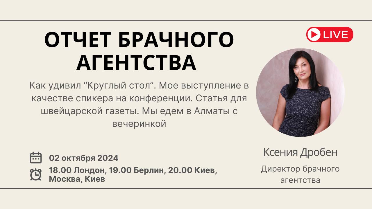Уже сегодня мы встречаемся на еженедельном открытом девочкином вебинаре Я расскажу о том, как прошел Круглый стол (были очень интересные вопросы), как прошло мое выступление спикером на конференции, о моем интервью для швейцарской газеты 20 Minuten, наш грандиозный проект в Алматы, расскажу интересные ситуации и отвечу на ваши вопросы Вебинар «Отчет брачного агентства» состоится сегодня, в среду 2 октября Время: 18.00 по Лондону, 19.00 по Берлину, 20.00 по Минску, Киеву, Москве Вебинар пройдет на платформах RuTube - https://rutube.ru/channel/24748934/ YouTube Ksenia Droben https://www.youtube.com/@KseniaDrobenPartnervermittlung Страница Facebook https://www.facebook.com/ksenia.droben Группа Facebook https://www.facebook.com/groups/datingmarriageagency VK https://vk.com/kseniadroben Instagram https://www.instagram.com/kseniadroben/ - @kseniadroben Tiktok: @kseniadrobendating Telegram - https://t.me/+1r3gxV3q1gIxMjRi Длительность – примерно 60 минут Если вы не сможете присутствовать лично, то вебинар можно будет посмотреть в записи Буду рада увидеться с вами и ответить на ваши вопросы