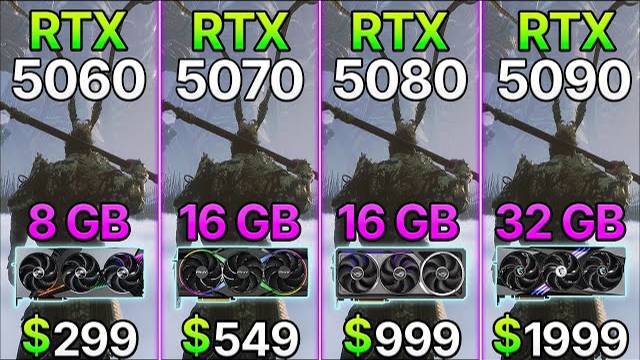 RTX 5060 8 GB vs RTX 5070 12 GB vs RTX 5080 16 GB vs RTX 5090 32 GB - Test in 10 Games