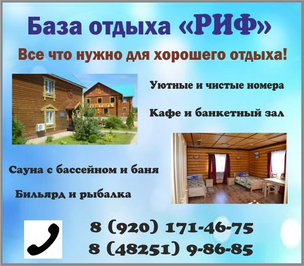 База отдыха "РИФ" в Торжке. Недорогая гостиница, кафе, банкетный зал, бильярд, тренажерный зал, сауна и русская баня на пути между Москвой и Петербургом. Рыбалка. База отдыха "Риф-Торжок" считается лучшей на территории Торжка, удовлетворяющая всем требованиям туристов по достаточно скромной цене. Она расположилась в 2,5 км от центра Торжка на Ленинградском шоссе. ГОСТИНИЦА была открыта в 2009 году при спортивно-оздоровительном клубе. В ней семь люксовых номеров – пять двухместных и два с двуспальной кроватью для молодоженов. Это замечательное место, где можно отдохнуть путешественнику. В номерах чисто и уютно, новая мебель, есть все необходимое. Номера оборудованы холодильником, спутниковым TV, есть подключение к сети Интернет. Во всех номерах санузел с душевой кабиной. Курить в номерах не разрешается. Проживающие в гостинице могут воспользоваться услугами прачечной и гладильной, заказать завтрак, кофе, чай, услуги мини-бара, бесплатно вызвать такси. Желающие могут посетить РУССКУЮ БАНЮ или VIP-САУНУ, поплавать в бассейне, сыграть в бильярд, позаниматься на тренажерах, отдохнуть в комнате отдыха, воспользоваться бесплатной охраняемой стоянкой, услугами банкетного зала, посетить кафе-барбекю. В КАФЕ-БАРБЕКЮ всегда у нас в прямом эфире трансляции футбольных и хоккейных матчей, бои боксёров, профессионалов, лыжные гонки, битвы бойцов без правил. Посетив наше кафе, Вы сможете попробовать изысканные блюда кавказкой и русской кухни, здесь проводятся корпоративные вечера, отмечаются дни рождения и другие мероприятия. ТРАКТИР "СЛАВЯНСКИЙ" с большим залом на 78 мест и vip - залом на 12-14 мест, можно использовать для проведения конференций, корпоративных вечеринок, свадеб, дней рождения и других различных мероприятий. У нас всегда для вас большой выбор блюд русско-славянской кухни. Поблизости от комплекса имеется водоем, где за определенную плату любители рыбной ловли могут заняться рыбалкой – в водоеме полно карпов и карасей. Тверская область, Торжокский район, г. Торжок, Ленинградское шоссе, д. 10У Тел.: 8 (920) 171-46-75. Тел.: 8 (48251) 9-86-85. Подробнее об услугах и ценах читайте на нашем сайте: rif-clab.ru В Интернете нас находят, в частности, и по таким словам: гостиницы Торжок, недорогая гостиница Торжок, рыбалка Торжок, кафе Торжок, банкетный зал Торжок, кафе-барбекю Торжок, трактир Торжок, бильярд Торжок, русская баня Торжок, сауна Торжок, корпоративные вечера Торжок, корпоративы Торжок, дни рождения Торжок, корпоративные вечеринки Торжок, свадьбы Торжок, база отдыха Торжок. #гостиницы #Торжок #недорогаягостиница #рыбалка #кафе #банкетныйзал #кафебарбекю #трактир #бильярд #русскаябаня #сауна #корпоративныевечера #корпоративы #днирождения #корпоративныевечеринки #свадьбы #базаотдыха
