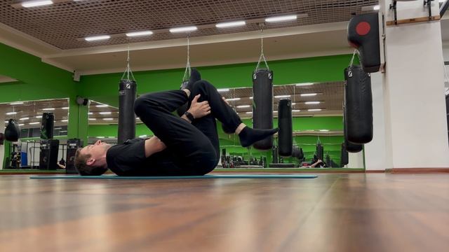 Растяжка ягодичных и грушевидной лёжа на полу обхватив бедро