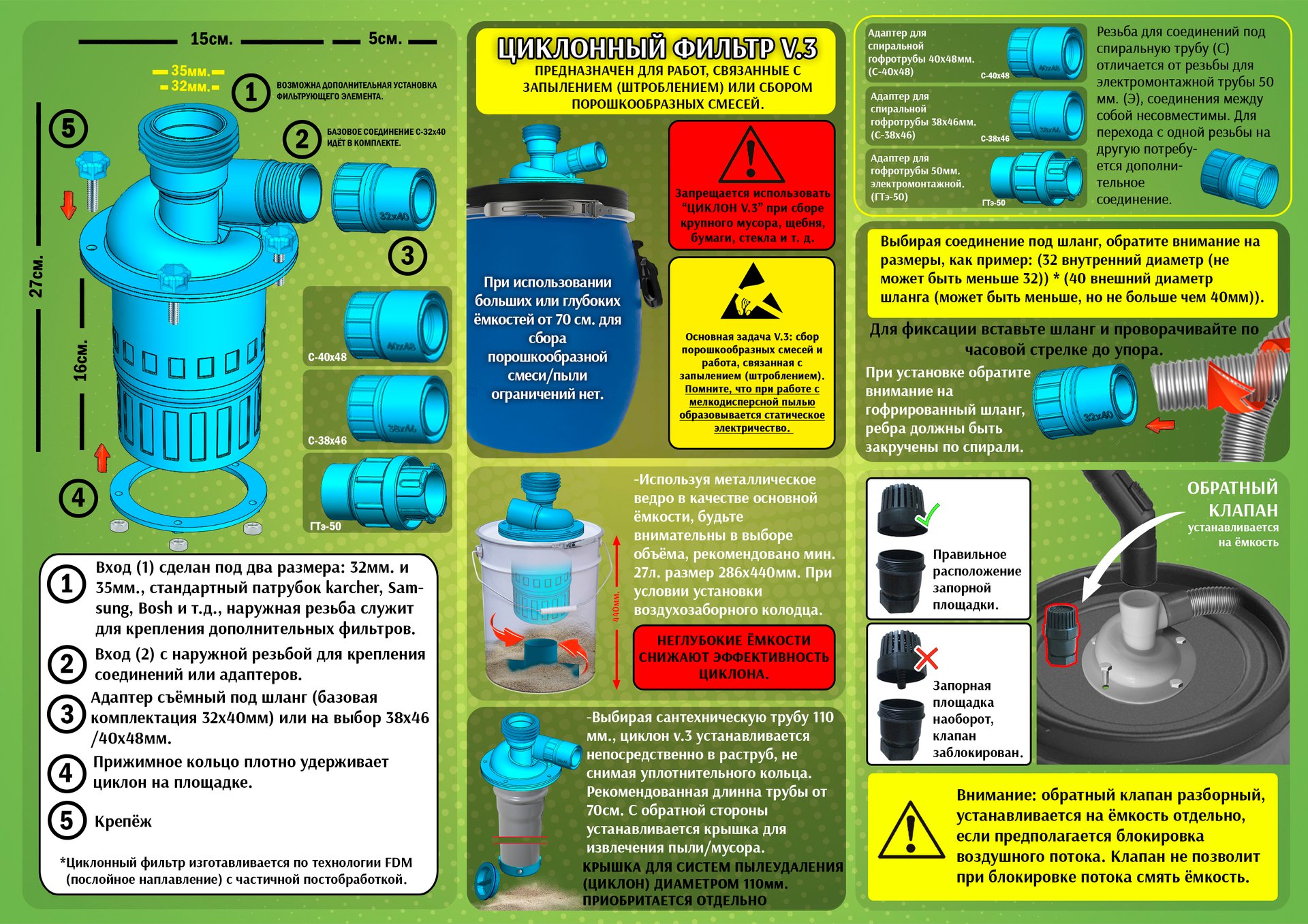 Циклoнный фильтp v.3 основная задача: сбор порошкообразных смесей и работа, связанная с запылением (штроблением / шлифованием).