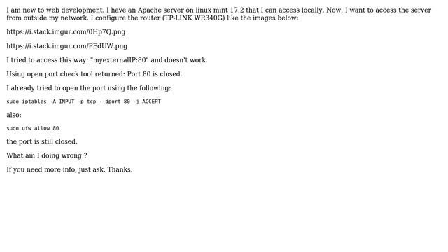 Web server router forwarding: port 80 closed - Linux Mint Helpful? Please support me on Patreon: https://www.patreon.com/roelvandepaar With thanks & praise to God, and with thanks to the many people who have made this project possible! | Content (except music & images) licensed under CC BY-SA https://meta.stackexchange.com/help/licensing | Music: https://www.bensound.com/licensing | Images: https://stocksnap.io/license & others | With thanks to user G_comp (superuser.com/users/507579), and the Stack Exchange Network (superuser.com/questions/984489). Trademarks are property of their respective owners. Disclaimer: All information is provided "AS IS" without warranty of any kind. You are responsible for your own actions. Please contact me if anything is amiss at Roel D.OT VandePaar A.T gmail.com