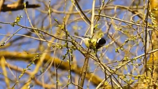 Большая синица и лазоревка выделывают настоящие акробатические трюки на ветках деревьев.