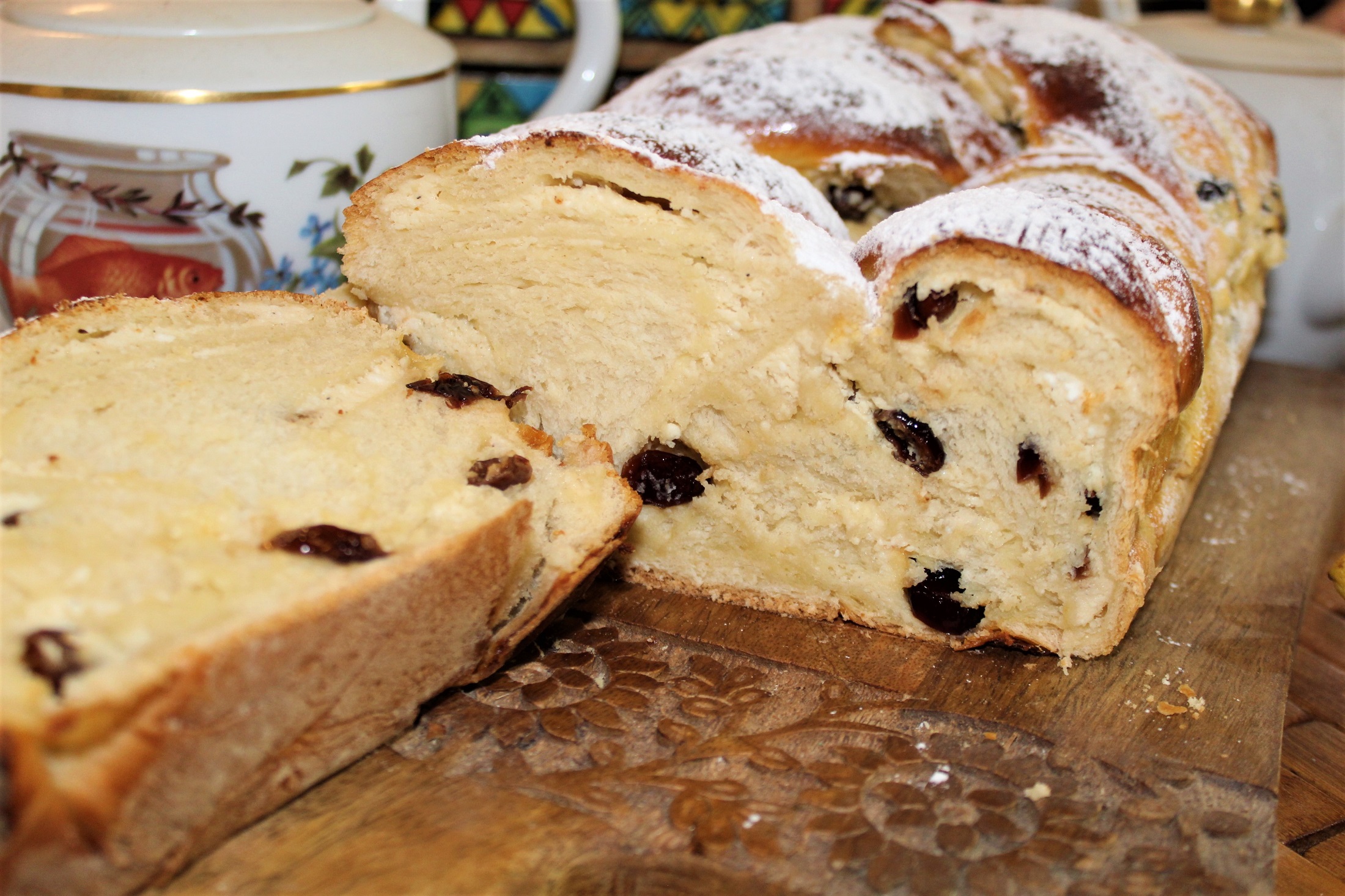 Для рецепта потребуется: Для теста: 500г белой пшеничной муки 1 яйцо 20г свежих дрожжей 30г мёда 30г размягчённого сливочного масла 10г соли, 30г сахара 250мл молока Для начинки: 250г творога 200г сметаны 60г сахарной пудры 2 яйца 100г изюма 20г кукурузного крахмала ложечка ванили