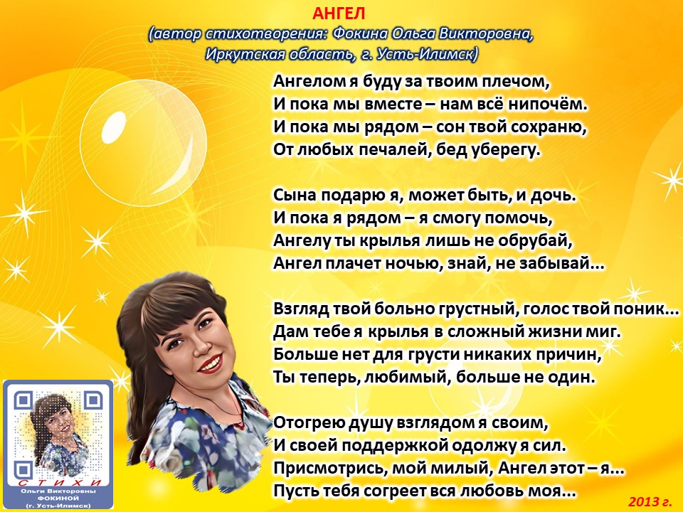 Читает автор стихотворения: ФОКИНА ОЛЬГА ВИКТОРОВНА (Иркутская область, город Усть-Илимск) СТИХИ: https://stihi.ru/2018/07/08/3790 БИОГРАФИЯ: http://www.proza.ru/2019/10/08/1473 ВЫИГРЫВАЙТЕ КНИГИ БЕСПЛАТНО: https://proza.ru/2017/09/17/447 ОТЗЫВЫ ЧИТАТЕЛЕЙ: http://www.proza.ru/2019/11/29/611 Из книги Фокиной Ольги Викторовны (Усть-Илимск) «Несу добро в ладошках!»: [все стихотворения с 2005 по октябрь 2020 гг., проза, авторские песни, интервью]. – Москва: МГО Союза писателей России, 2020 г. – 886 стр., ил. ISBN 978-5-7949-0826-8 АНГЕЛ (автор стихотворения: Фокина Ольга Викторовна, Иркутская область, г. Усть-Илимск) Ангелом я буду за твоим плечом, И пока мы вместе – нам всё нипочём. И пока мы рядом – сон твой сохраню, От любых печалей, бед уберегу. Сына подарю я, может быть, и дочь. И пока я рядом – я смогу помочь, Ангелу ты крылья лишь не обрубай, Ангел плачет ночью, знай, не забывай... Взгляд твой больно грустный, голос твой поник... Дам тебе я крылья в сложный жизни миг. Больше нет для грусти никаких причин, Ты теперь, любимый, больше не один. Отогрею душу взглядом я своим, И своей поддержкой одолжу я сил. Присмотрись, мой милый, Ангел этот – я... Пусть тебя согреет вся любовь моя... 8 июля 2013 г.