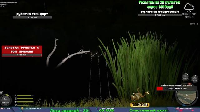 Поддержка донатом https://new.donatepay.ru/@1032463 Альтернативный донат https://www.donationalerts.com/r/kalyamba11 5536913964533059 карта Тинькоф Если стрим лагает,смотри стрим на трово https://trovo.live/s/Kalyamba_na_Ribalke Мой ВК - https://vk.com/kalyantv НИК в игре kalyan11 НАШ ДИСКОРД СЕРВЕР https://discord.gg/pFsEn9e9 Заказ водоема на 1 час - 500р ( весь стрим 2500р ) Модерка на канале 1200р ( каждая следующая на 100р больше) Озвучка доната на 40р,50р,100р,200р,300р,500р,1000р ✅Призы в рулетке "ЗОЛОТАЯ" ✔ ЗОЛОТО ✔ ПРЕМ ✔ КАТУШКИ ЮБИЛЕЙНАЯ БОРЕЛИКА, ВЕНГИ, ТАЙГА, СИЛЬВЕР 80, И другие ✔ ПАЛКИ ПИЛКЕРНАЯ, ДОНКА МОРСКИЕ, ✔ РОД ПОД, СТУЛЬЯ ✅Призы в рулетке СТАНДАРТ : ✔ катушкИ ЮБИЛЕЙНАЯ БОРЕЛИКА, ВЕНГИ, ТАЙГА, СИЛЬВЕР 80, И другие ✔ катушки 60 для медного ( ЭВИИ, НАТОРЫ, ГОЛДА, и тд) ✔ ПИЛКЕРНОЕ УДИЛИЩЕ КОРОЛЕВА ОКЕАНА ✔ Морское Донное удилище ✔ прем ( 3, 7, 30 дней) ✔ золото ( 1, 3, 5, 10, 20 ,50) ✔ билет на море ( 1, 3, 5 дней) ✔ голд наживка и др. ✅Призы в рулетке "СТАРТОВАЯ" ✔ катушка "silver80" ✔ катушка "БЕЛЫЙ КАЛИБР" ✔ катушка "Черный калибр" ✔ катушка "Протон" ✔ катушка "Нарга 6000" ✔ Набор Фидерист и спинингист ✔ Карповик Фортуна ✔ фидерные удилища ✔ прем, золото, алкашка, наживки и тд P.s Рулетка это не казино, а награда за поддержку стримера. Вечный ТОП ПОДДЕРЖКИ (11.05.2024) 1. Dimon_pokemonchik 119 784 2. Interceptor 75 508 3. Skreb79 71 261 4. une personne 68 619 5. Нарвал77 31 550