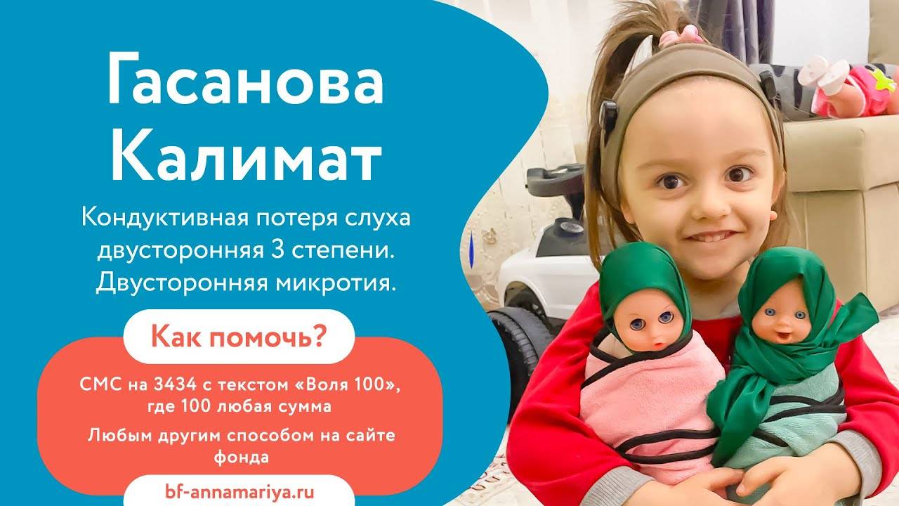 🆘 У девочки отсутствуют слуховые проходы, она не слышит. Необходима дорогостоящая операция!🆘 Калимат родилась очень слабой девочкой и весила всего 2,5 кг. При рождении ей поставили диагноз – отсутствует слуховых проходов с двух сторон, микроти. В 6 месяцев ей впервые надела слуховой аппарат и родители сразу увидели положительную динамику. Однако, чтобы завершить эту историю и вернуть Калимат полноценную жизнь, ей необходима операция. 👨🏻⚕️ Данную операцию делает единственная клиника в мире. К счастью доктора дают отличные прогнозы и готовы помочь!🏥 Самой большой проблемой на данный момент является то, что с каждым днем кости черепа Калимат становятся все тверже, в связи с этим ухудшается и слух. Если не провести операцию вовремя, есть вероятность, что она оглохнет навсегда. У детей с таким диагнозом велика вероятность появления опухоли. Ее пока у девочки нет, но врачи не дают никаких гарантий, что она не появится в будущем. 🙏 Время бежит неумолимо, а денег на операцию у семьи просто нет. Помогите девочки навсегда избавиться от страшной болезни! 🙏 Как помочь? 🔵 отправьте СМС на номер 3434 с текстом «Воля 100» (где 100, любая сумма) 🔵 Сделайте пожертвование любым удобным способом по ссылке - https://bf-annamariya.ru/1746-gasanova-kalimat.html