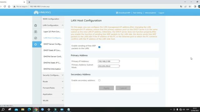 User: telecomadmin Password: admintelecom IP por defecto: 192.168.100.1 _______________________________ IP Router principal: 192.168.2.1 (IP de modem del proveedor de internet) IP Router Huawei : 192.168.2.100 Mascara: 255.255.255.0 El Huawei EchoLife HN8245Q es un ONT de tipo de enrutamiento utilizado en la solución de acceso totalmente óptico Huawei. Utiliza la tecnología XG-PON para proporcionar acceso de banda ultra ancha a los usuarios. Proporciona 4 GE + 2 POTS + 2 USB + 2 WiFi ( 4 puertos Ethernet GE, 2 puertos POTS, 2 puertos USB, 1 puerto WiFi 2.4G y 1 puerto WiFi 5G ) . El reenvío de alto rendimiento proporciona servicios de video VoIP, Internet y HD, y proporciona a los usuarios soluciones de terminal ideales y capacidades de soporte de servicio orientadas al futuro.