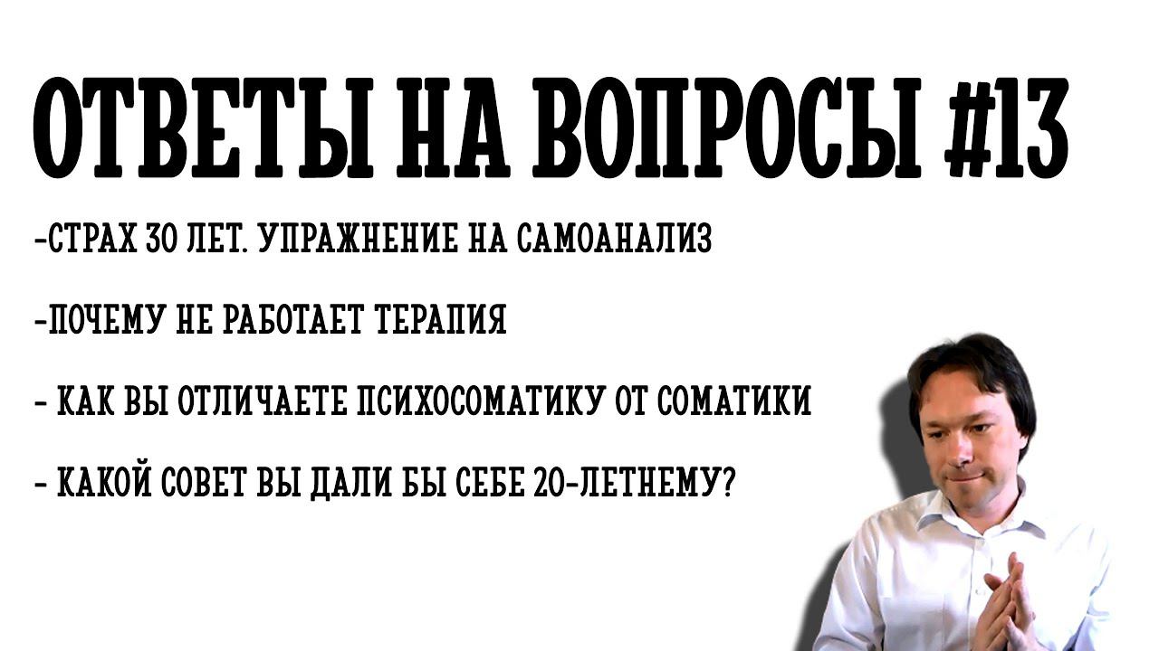 00:20 - Мне исполнилось 30 лет. Страх возраста. Упражнение на самоанализ 03:53 - Почему не работает терапия? После сеансов откатывается назад. 08:00 - Боня 08:10 - Как вы отличаете психосоматику от соматики 12:18 - Какой совет вы дали бы себе 20-летнему?